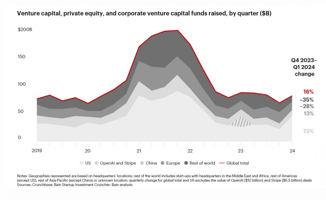 O investimento em capital de risco atingiu US$ 89 bilhões globalmente, um aumento de 16% em relação ao último trimestre de 2023