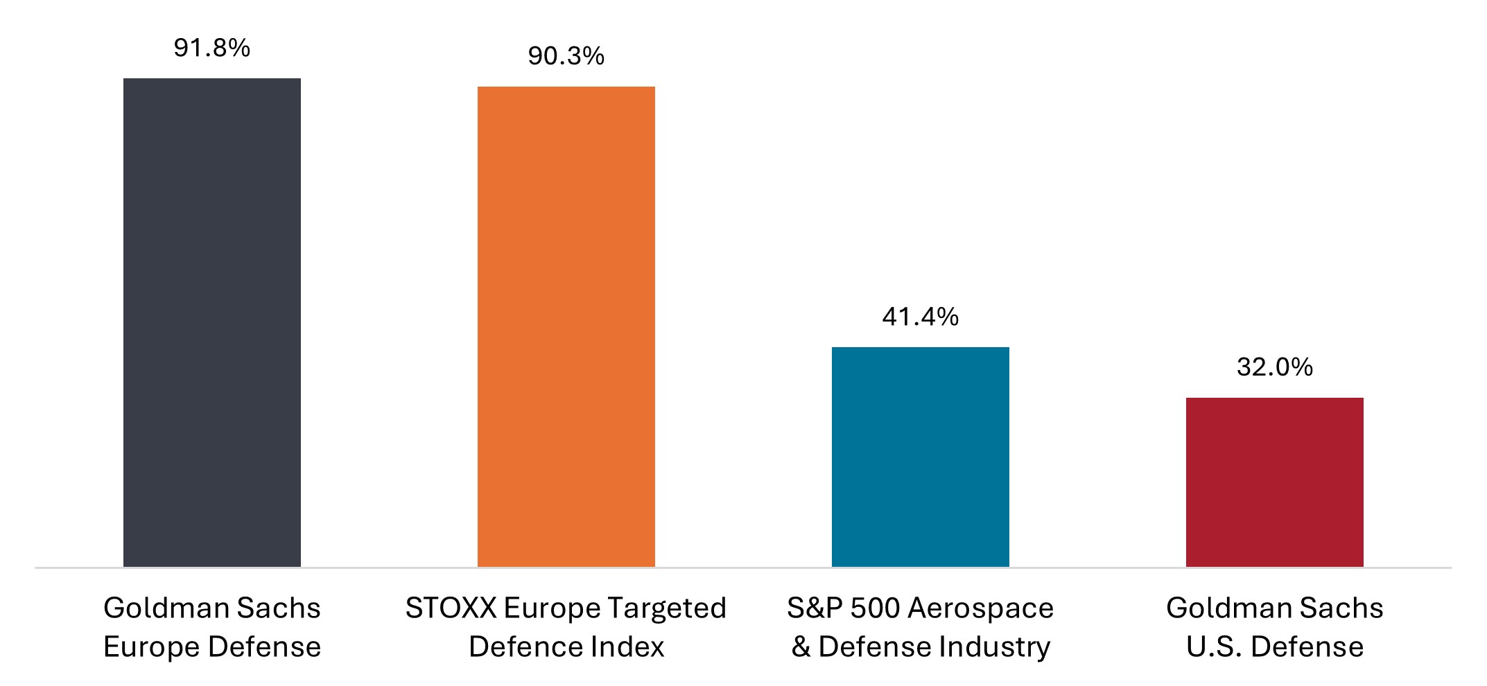 Fonte: Bloomberg, dados de 31 de dezembro de 2024 a 31 de dezembro de 2025. A cesta Goldman Sachs Europe Defense é composta por empresas europeias com exposição a gastos com defesa. O índice STOXX Europe Targeted Defence é composto por empresas europeias que obtêm receita com o fornecimento de equipamentos e serviços militares. O índice S&P 500 Aerospace & Defense Select Industry é composto por ações do S&P 500 classificadas no subsegmento Aeroespacial e de Defesa do GICS. A cesta Goldman Sachs US Defense é composta por empresas americanas com exposição a gastos com defesa nos EUA.