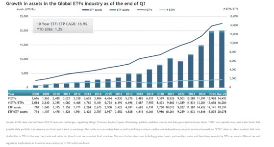 According to ETFGI data, first-quarter net inflows, totaling $626.42 billion, are the highest ever recorded, surpassing the previous peak of $463.51 billion in 2025 and $397.51 billion in 2024. March therefore marked the 82nd consecutive month of net inflows into the global ETF industry.