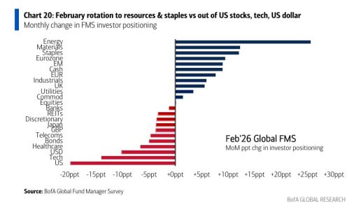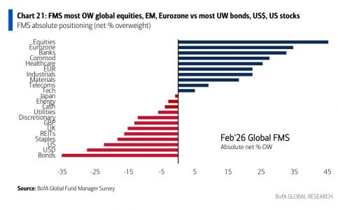 According to Bank of America’s global fund manager survey, investors are more overweight in equities, emerging markets, and the eurozone, and more underweight in bonds, the U.S. dollar, and the U.S.