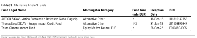 En cambio, como indica el informe, sólo tres fondos alternativos están clasificados en el artículo 9 (véase la ilustración 3), lo que demuestra que es mucho más difícil diseñar un producto de inversión alternativo con una estrategia formal de inversión sostenible e inversiones 100% sostenibles (a excepción del efectivo y los instrumentos de cobertura).