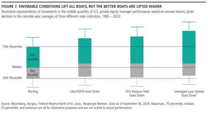 Así pues, es poco probable que las perspectivas de rendimiento de las participaciones en private equity en los próximos años vengan determinadas por los recortes de tipos de la Reserva Federal en sí mismos, sino por su relación con la economía.