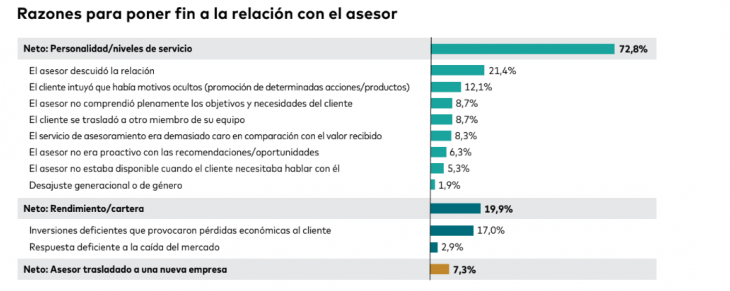 La importancia de estos factores intangibles también se refleja en las causas por las que se interrumpen las relaciones con los asesores. Según los profesionales encuestados, la mayoría de las finalizaciones se deben a motivos personales o al nivel de servicio (72,8%), mientras que solo un 19,9% lo atribuye a un rendimiento inadecuado de la cartera. La causa más frecuente es la relación deteriorada (21,4%).
