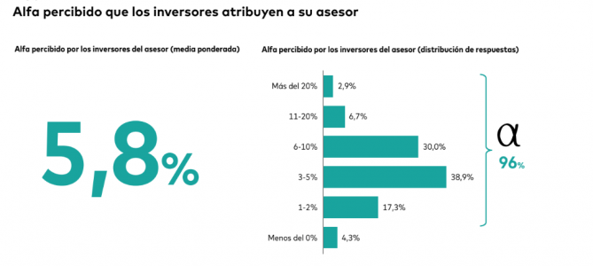 Aun así, la satisfacción con el rendimiento es alta: el 95,7% de los inversores considera que su asesor contribuye positivamente al crecimiento de la cartera. De hecho, los encuestados estimaron que su asesor genera un alfa percibido medio del 5,8% anual, tras descontar comisiones.
