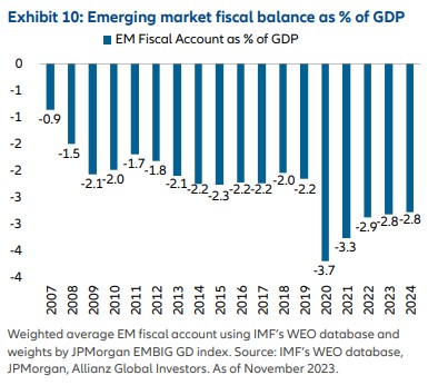 Por término medio, los déficits fiscales de los mercados emergentes se han reducido desde que se ampliaran a raíz de la pandemia. En términos relativos, la mejora ha sido mayor que en los mercados desarrollados. Un déficit fiscal medio del 2,8% del PIB para 2023 es inferior al 3,7% alcanzado en 2020 y menor al de los mercados desarrollados.
