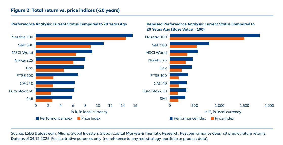 Sin embargo, desde Allianz GI advierten de que los dividendos aportan una contribución a menudo infravalorada a la rentabilidad total de una inversión en renta variable, para un horizonte de inversión de 20 años. “En cierta medida, la rentabilidad total de los respectivos índices de referencia (basada en el índice de rentabilidad en cada caso) está impulsada de forma significativa por los dividendos, como se aprecia al compararla con el índice de precios. Esto se debe a que, a diferencia de lo que ocurre en el índice de precios, los dividendos no se pagan, sino que se reinvierten. Esta reinversión genera el deseado efecto de capitalización (interés compuesto). La aportación de los dividendos a la rentabilidad total de una inversión se hace aún más evidente al analizar el comportamiento de los índices con y sin reinversión, en lugar de fijarse únicamente en la rentabilidad total media a lo largo del periodo de inversión”, defienden desde la gestora.
