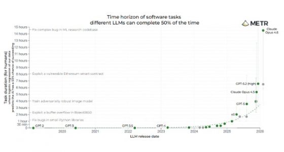 El punto de partida, que no necesariamente ha de cumplir con las fases que propone Citrini, está basado en datos. Como podemos ver en esta gráfica de METR, el salto cualitativo en capacidad que en tan solo un par de meses ofrece el Opus 4.6 de Anthropic respecto al GPT 5.2 de Open AI es enorme.