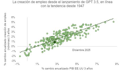 No obstante, y como vemos en la gráfica, lo sucedido en los últimos tres años, desde el lanzamiento comercial de GPT-3.5 en materia de creación de empleo, entra dentro de la normalidad del crecimiento del PIB – crecimiento de empleo registrada desde 1947. La tesis del artículo puede acabar sucediendo, pero no se aprecia de momento.