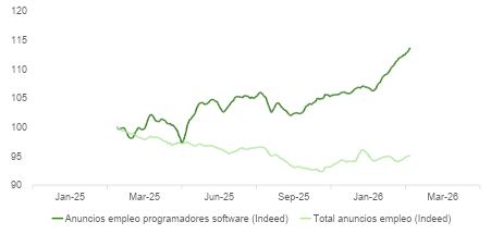 En este informe de Citadel, que desmonta una a una las premisas de “The 2028 Global Intelligence Crisis”, se muestra una conclusión similar desde otra perspectiva: los anuncios de oferta de trabajo para programadores aumentan (en absoluto y relativo al total de ofertas de empleo, según Indeed), a pesar del supuesto auge en “vibe coding”.