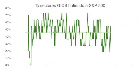 De momento, las mejoras se han concentrado en industrias muy relacionadas con la tecnología. Los hiperescaladores siguen invirtiendo fuertemente pero a la vez comienzan a dar muestras de su capacidad de monetizar ese gasto. Como ya sucedió con el auge de internet en la década de los años 90, el boom inversor irá trasladándose hacia otros sectores que también buscaran en la IA una herramienta para recortar costes y mejorar márgenes. Como avanzábamos a finales del 2025, tener una cartera con perfil más cíclico tiene sentido en este contexto. Como vemos en la gráfica desde enero, el comportamiento del S&P se sostiene sobre una base sectorial más amplia que la de hace solo un par de meses.