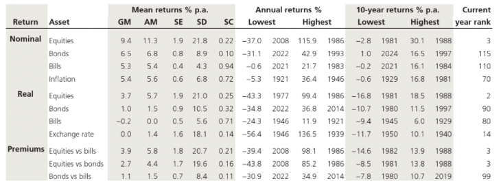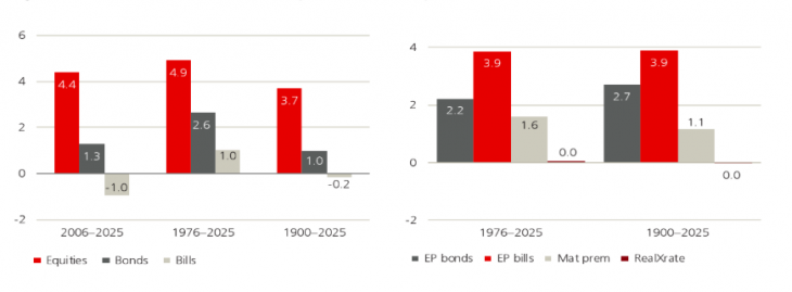 Figura 153: Rentabilidades reales anualizadas y primas de riesgo (%) para España, 1900-2025