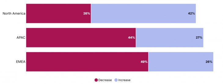 Si bien los asesores en general parecen estar reconsiderando la concentración de sus carteras, el grado de cambio varía según la región. Por ejemplo, en la región EMEA presenta la mayor retirada. En concreto, un 49 % de asesores que indican planes de disminuir la exposición a EE. UU., frente a un 26 % que planea aumentarla. Por su parte, APAC también refleja un creciente énfasis en la diversificación y las oportunidades de crecimiento regional, con un 44 % planeando reducir la asignación en acciones estadounidenses y un 27 % anticipando un aumento; Y Norteamérica muestra una reevaluación más moderada, con solo un 26 % esperando reducir la exposición a EE. UU. y un 42 % esperando incrementarla.