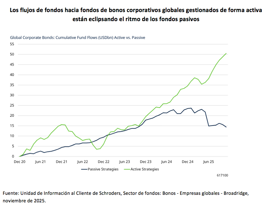 Pese a la buena acogida que tienen los fondos pasivos entre los inversores, durante los últimos años, los flujos de fondos hacia vehículos de bonos corporativos globales gestionados activamente están superando el ritmo de los pasivos.