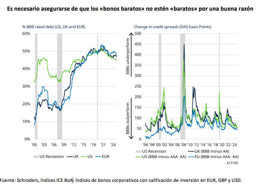 Según su análisis, tras una recesión, suele producirse un aumento de la proporción de empresas con calificación BBB dentro de los índices de grado de inversión, lo que refleja un deterioro generalizado de la calidad crediticia en todo el mercado de bonos corporativos. “Es precisamente en estos periodos cuando suele darse una mayor diversificación de emisores y la oportunidad de adquirir bonos baratos en relación con su ‘valor real’. Sin embargo, se necesita un proceso que permita distinguir entre los emisores que han sido injustamente castigados por la caída del mercado y los que realmente merecen ser considerados ‘bonos baratos’”, señalan Wright y Murphy.
