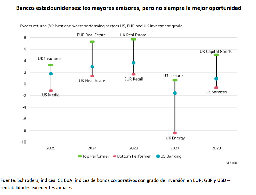 “¿Sabías que los que monopolizan los principales emisores de los índices mundiales de bonos corporativos con calificación grado de inversión son los grandes bancos estadounidenses? Quizás sean los mayores emisores, pero como muestra el gráfico siguiente, no siempre representan la mejor oportunidad”, afirman los expertos de la gestora. Y matizan que, aunque dentro de estos sectores también hay divergencias entre los emisores, una vez más, un bono solo ofrece valor real si no es simplemente barato por una razón. “Ahí es donde realmente entra en juego el análisis fundamental y los controles de riesgo”, defienden.
