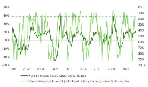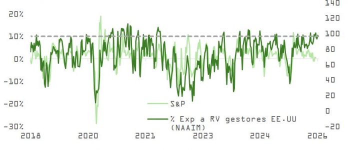 El mercado ha optado por ignorar hasta ahora las tensiones geopolíticas (Irán, Groenlandia, amenazas arancelarias, presiones a la Fed) por una razón fundamental: ninguno de estos eventos ha alterado de forma material las previsiones de beneficios o inflación. La volatilidad implícita en equity, FX y crédito sigue en zona de complacencia, mientras los spreads de high yield están en niveles no vistos desde 2007. La encuesta de posicionamiento de NAAIM revela una exposición optimista por parte de los gestores estadounidenses.