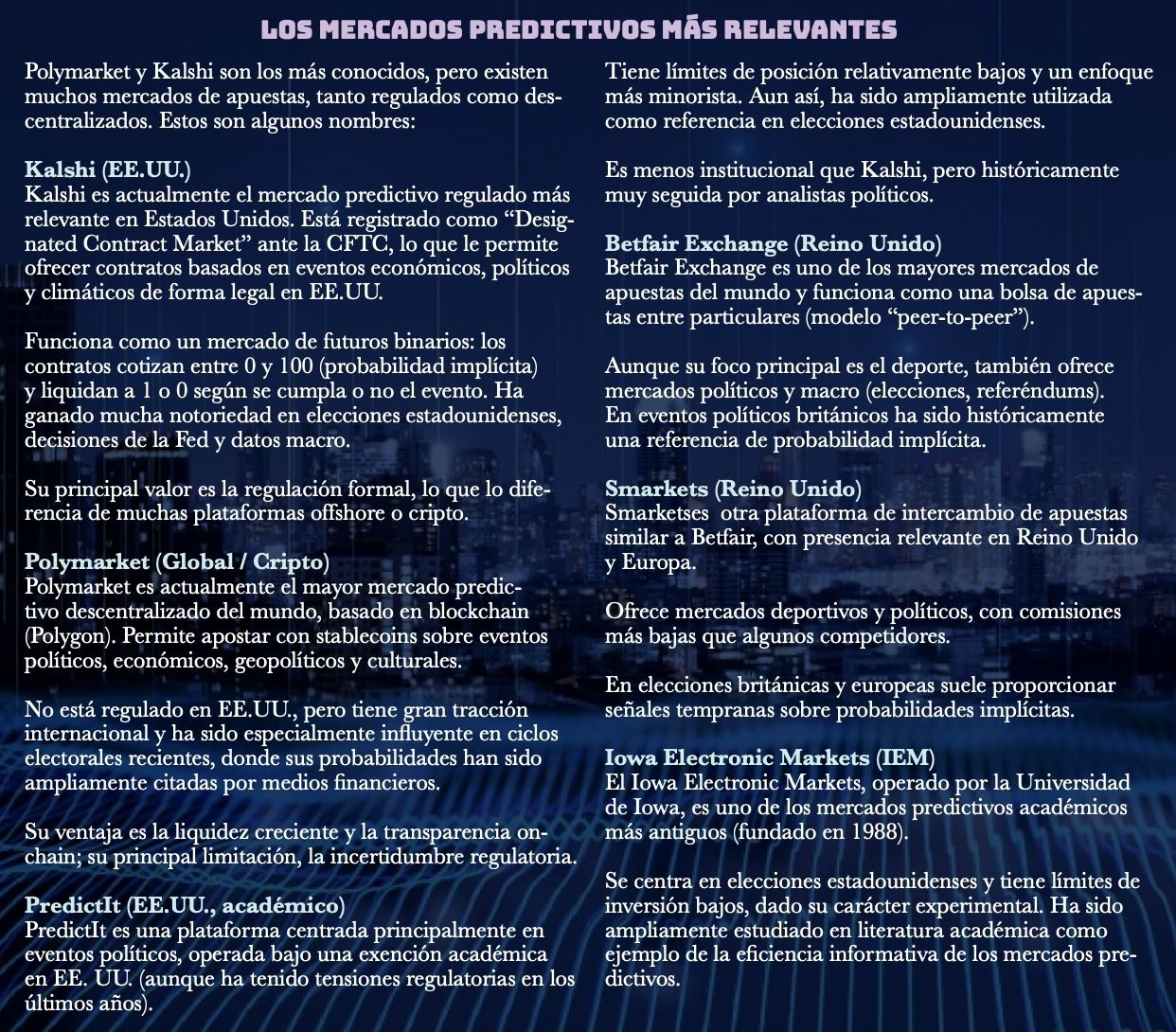 “¿Es ciencia? No. Es expectativa con dinero en juego. No reemplaza modelos ni bancos centrales, pero aporta algo escaso en mercados nerviosos, pulso. ¿Puede mover la aguja? A veces sí (en especial en eventos binarios o políticos). No es una brújula macro, sino un termómetro emocional. No estamos prediciendo mejor el futuro. Estamos negociándolo antes. Y en un mundo donde la información viaja a la velocidad del pánico, o de la euforia, eso no es una anécdota: es una nueva arquitectura del riesgo”.
