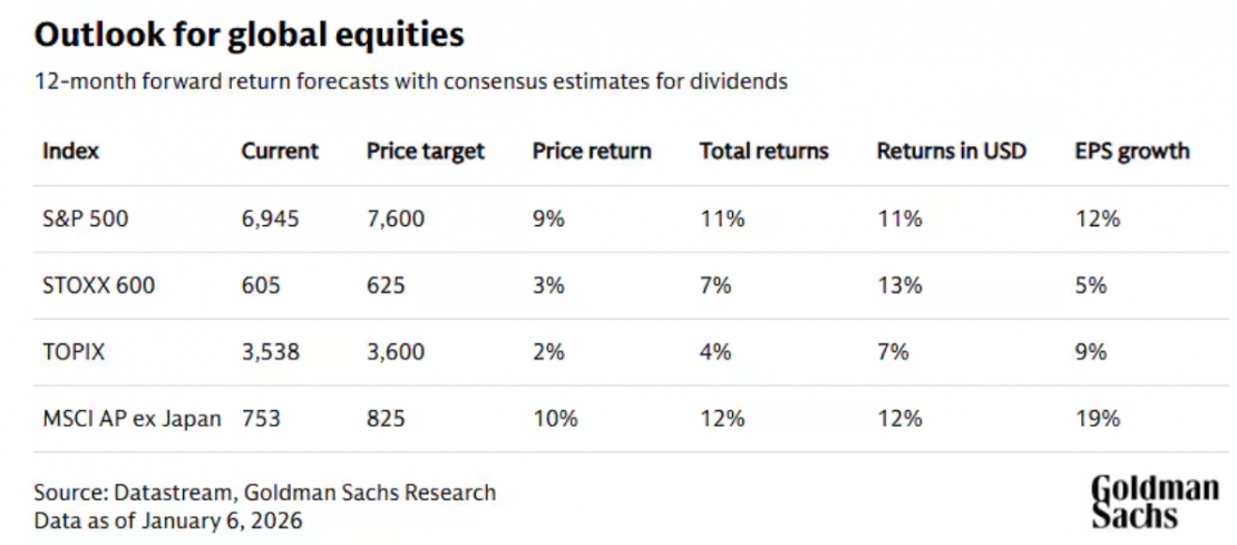 El mercado alcista global podría continuar en 2026, apoyado por el crecimiento de los beneficios empresariales y la solidez de la actividad económica, aunque las subidas de la renta variable no alcanzarían el fuerte avance registrado en 2025, según Goldman Sachs Research. La firma prevé una expansión continuada de la economía mundial en todas las regiones y nuevas bajadas moderadas de tipos por parte de la Reserva Federal de Estados Unidos.