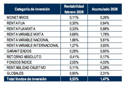 Los mercados también apoyan: los fondos experimentan en el mes una rentabilidad media positiva del 0,53%, acumulando un 1,47% en conjunto del año