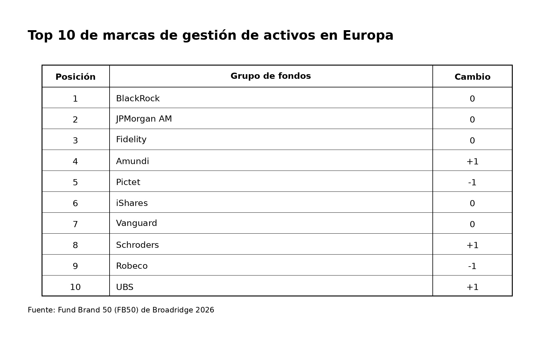 ¿Cuál diría que es la marca de gestora más valorada por los selectores de fondos e inversores europeos? Probablemente, los dos nombres que le vengan de forma inmediata a su mente sean BlackRock y JP Morgan AM. Enhorabuena, ha acertado. La última edición del Fund Brand 50 (FB50) de Broadridge identifica a estas dos gestoras como la primera y segunda más relevante, respectivamente, en Europa y revela que estamos ante un “panorama de marca cambiante”.