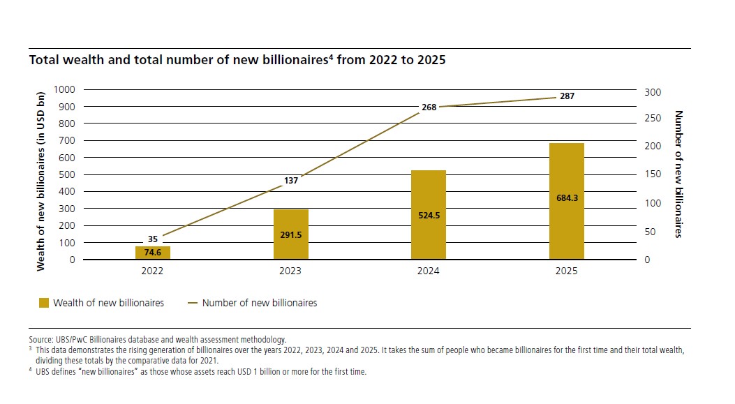 En 2025, 196 multimillonarios hechos a sí mismos llevaron la riqueza a un máximo histórico de 15,8 billones de dólares, un aumento del 13% en 12 meses y el segundo mayor incremento anual después de 2021. Según revela el último informe de UBS, titulado Billionaire Ambitions Report 2025, estamos ante una nueva oleada de multimillonarios, impulsada por la innovación empresarial y el aumento de las herencias.