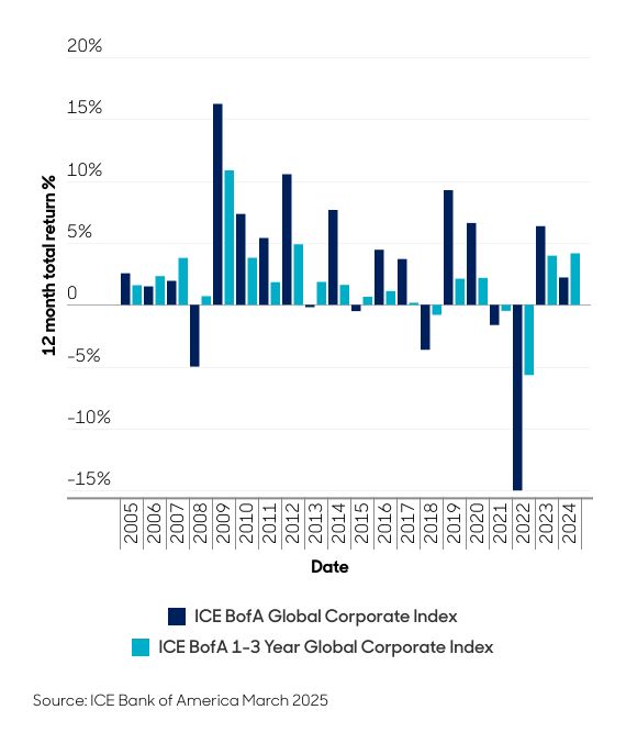 A largo plazo, la consistencia de los rendimientos es un importante argumento de venta para el crédito a corto plazo. Durante los últimos 20 años, el crédito a corto plazo ha ofrecido 17 años naturales de rendimientos positivos, con sólo tres años negativos. En comparación con el índice de todos los vencimientos, que tuvo 14 años positivos y seis negativos, esta cifra es muy favorable. Esta relativa estabilidad se debe en gran medida a la menor sensibilidad del crédito a corto plazo a las fluctuaciones de los tipos de interés, lo que lo convierte en una opción de inversión más predecible, especialmente en mercados turbulentos.