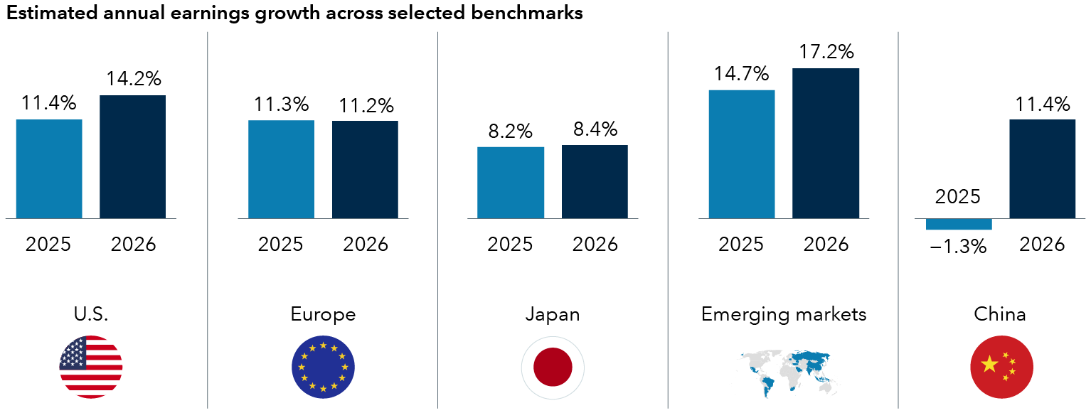 Sources: Capital Group, FactSet, MSCI, Standard & Poor’s. Estimated annual earnings growth is represented by the mean consensus earnings per share estimates for the years ending December 2025 and 2026, respectfully, across the S&P 500 Index (U.S.), the MSCI Europe Index (Europe), the MSCI Japan Index (Japan), the MSCI Emerging Markets Index (Emerging markets) and MSCI China Index (China). Estimates are as of 30 November 2025.