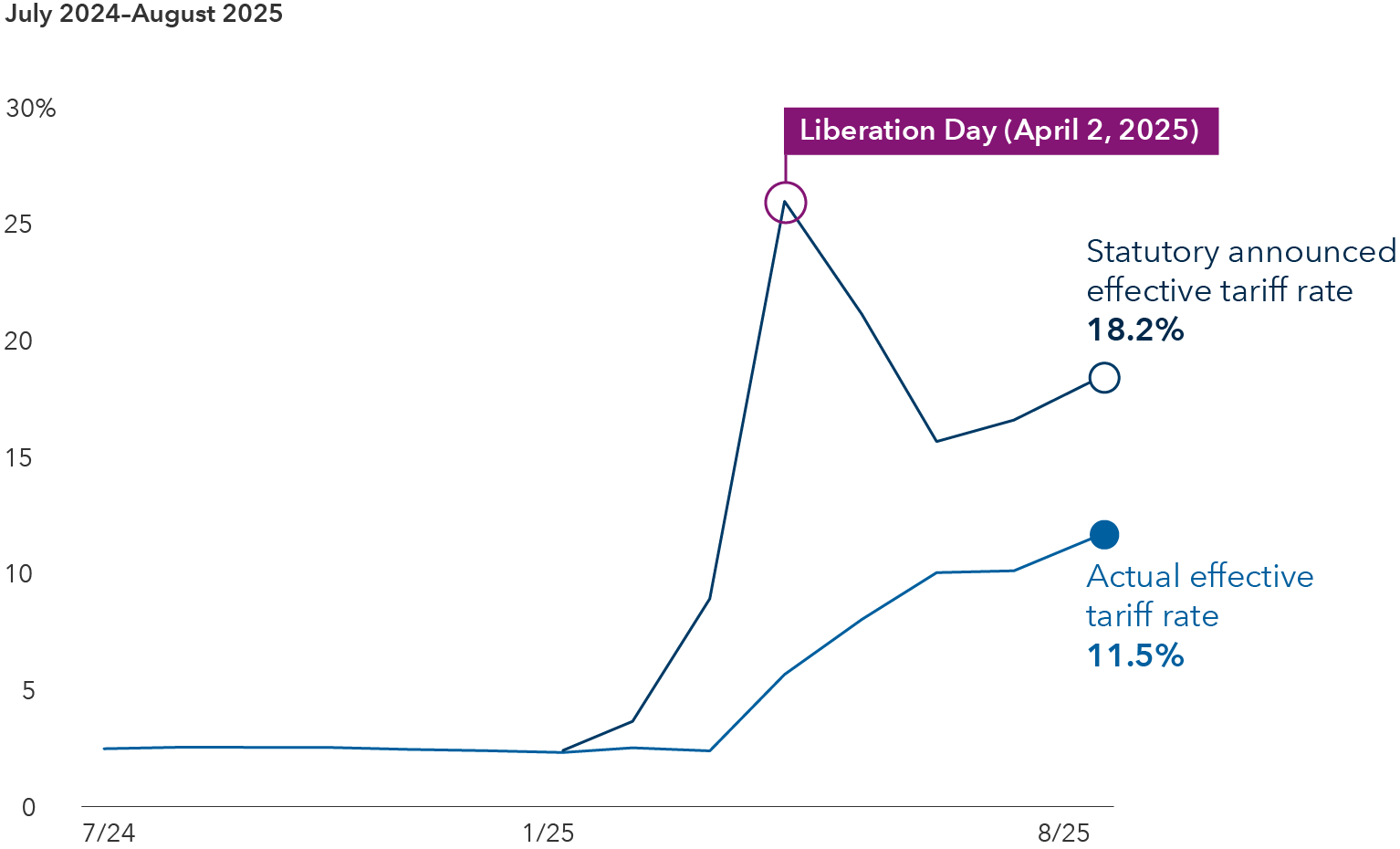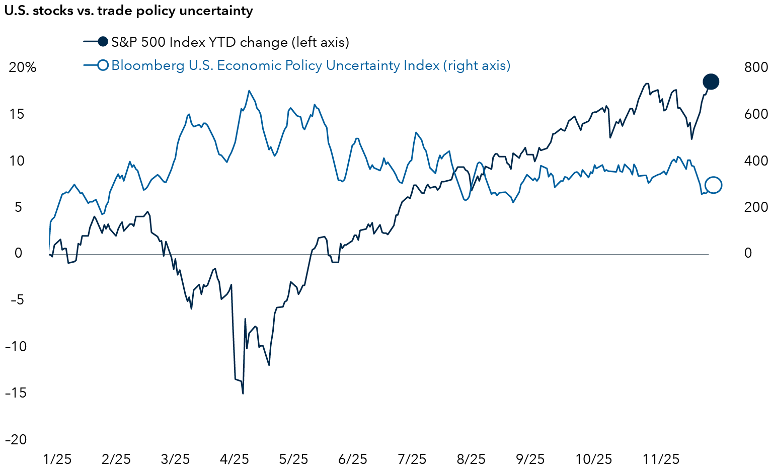 Sources: Top chart: Capital Group, The Yale Budget Lab, US Census Bureau, US Department of the Treasury. Latest data available through August 2025 as of 30 November 2025. Statutory announced tariff rate is the legally specified tax on imports by a government whereas the actual effective tariff rate is based on the actual tariff revenue collected by the government divided by total import value. Bottom chart: Capital Group, Bloomberg, RIMES, Standard & Poor’s. Bloomberg US Economic Policy Uncertainty (EPU) Index data is calculated as a rolling seven-day average using daily index values. S&P 500 returns calculated as total returns. Data as of 30 November 2025.