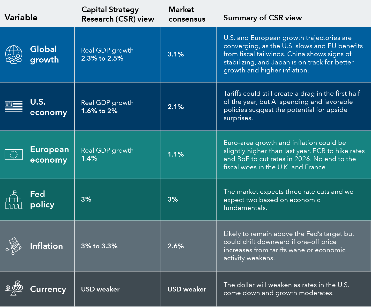 Sources: Capital Group, National Association for Business Economics, International Monetary Fund World Economic Outlook October 2025 (published 14 October). Market consensus refers to the general views, expectations or forecasts of market participants about key economic, financial or market metrics. ECB: European Central Bank, GDP: Gross Domestic Product, CSR: Capital Strategy Research, BoJ: Bank of Japan, BoE: Bank of England.