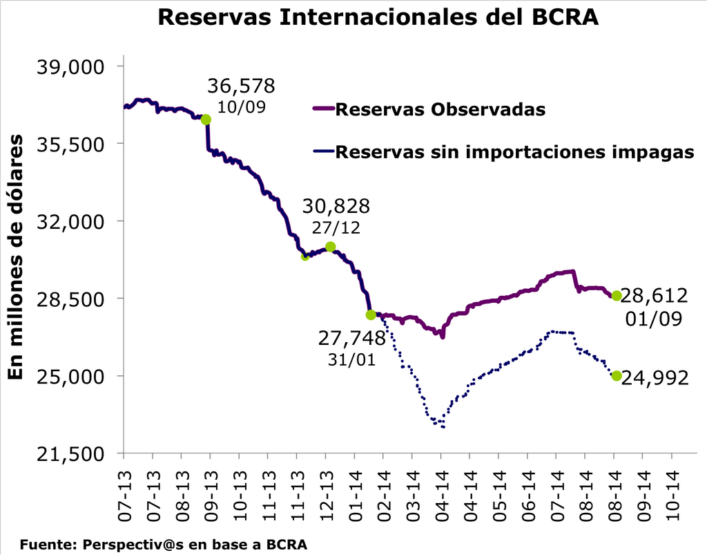 Por el lado real el gobierno nacional elevó la tasa de crecimiento del gasto público hasta la friolera del 55% interanual (junio 2013 – junio 1014). Contra un déficit fiscal que, bien medido, supera ampliamente el 5% del PBI, el financista estrella (BCRA) deberá imprimir a todo vapor para salir al cruce de tamaña brecha. A este ritmo con $ 160.000 milllones nos quedamos cortos. El crecimiento del stock de masa monetaria estuvo relativamente contenido en el orden del 20% anual medido entre junio 2013 – junio 2014, pero nuevamente comenzó a aumentar a partir de julio y sobre todo en agosto, mes en el que creció la friolera de $ 30.000 milllones. Presionar sobre las importaciones y no soltar dólares productivos con la consiguiente caída del nivel de empleo, es solo una parte del ajuste recesivo que ya se está implementando. Se calcula que las deudas con proveedores del exterior rondan los USD 5.000 milllones. El ritmo de emisión y caída de reservas netas que el segundo semestre depara hará el resto, presionando con dureza sobre el tipo de cambio nominal. Para que se entienda. Incluso el trade off entre recesión y menor tensión cambiaria puede convertirse en un mito donde coexistan con más fuerza los dos escenarios: recesión, aumento de gasto público, mayor emisión monetaria, preferencia por el dólar, caída de reservas, inflación en ascenso, devaluación. La trampa de liquidez vernácula.