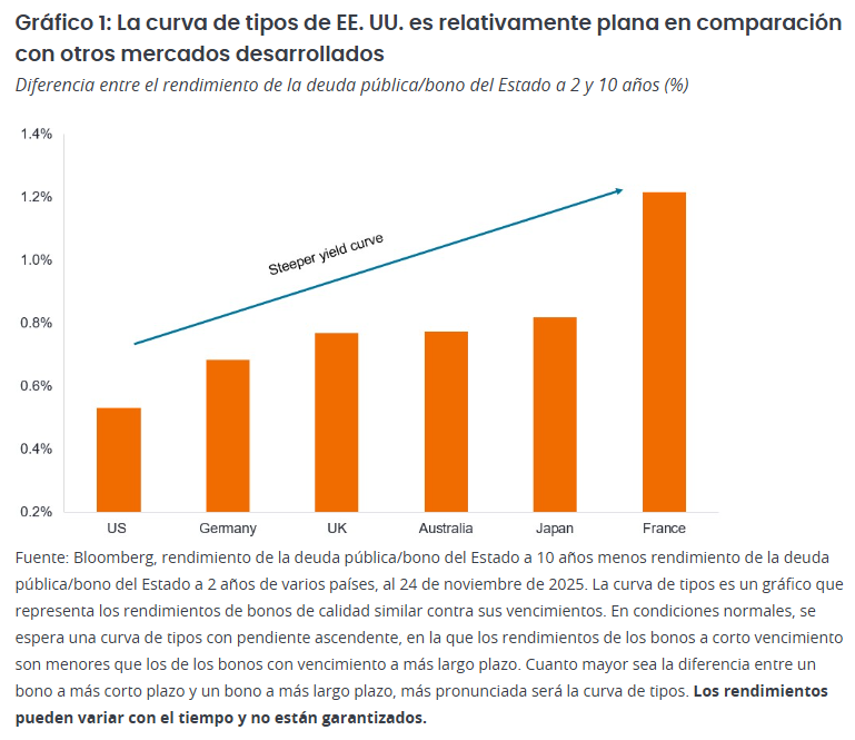 El mandato de Jerome Powell como presidente de la Reserva Federal de Estados Unidos (Fed) finaliza en 2026. La Casa Blanca se inclina por que el próximo presidente sea del «Equipo Trump», lo que implica una política monetaria flexible. Quienquiera que sea designado para el cargo ayudará a dar forma no solo a la política monetaria estadounidense, sino también al régimen de riesgo de los mercados a nivel mundial. Cabe esperar un mayor escrutinio sobre si los recortes están justificados (en respuesta a la debilidad del crecimiento económico o del empleo) o se consideran procíclicos (relajación a pesar de un fuerte crecimiento o una inflación por encima del objetivo). En cualquier caso, esperamos que los recortes tiren hacia abajo del extremo corto de la curva de tipos. Las perspectivas a lo largo de la curva son más ambiguas, lo que nos lleva a favorecer en general los valores a corto plazo, con la duración (sensibilidad a los tipos) más táctica durante todo el año.