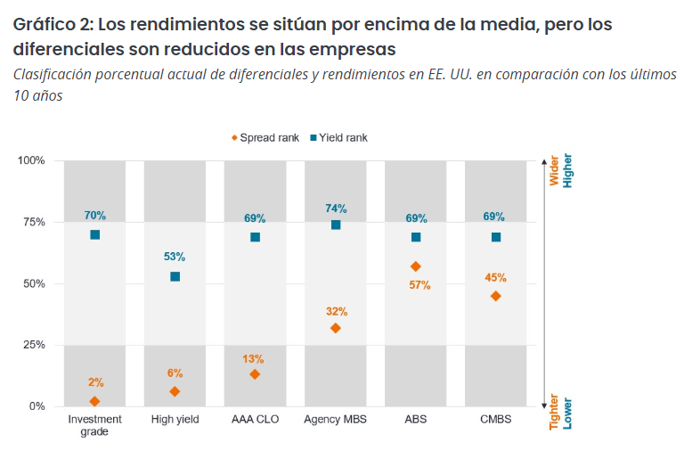 La confianza para prestar dinero a los prestatarios es alta, por lo que los diferenciales de crédito (el rendimiento adicional que pagan los bonos corporativos sobre la deuda pública de vencimiento similar) se encuentran en niveles históricamente ajustados (bajos), aunque están más cerca de los niveles medios para activos titulización como los valores respaldados por activos (ABS) y los valores respaldados por hipotecas (MBS) (véase el gráfico 2).