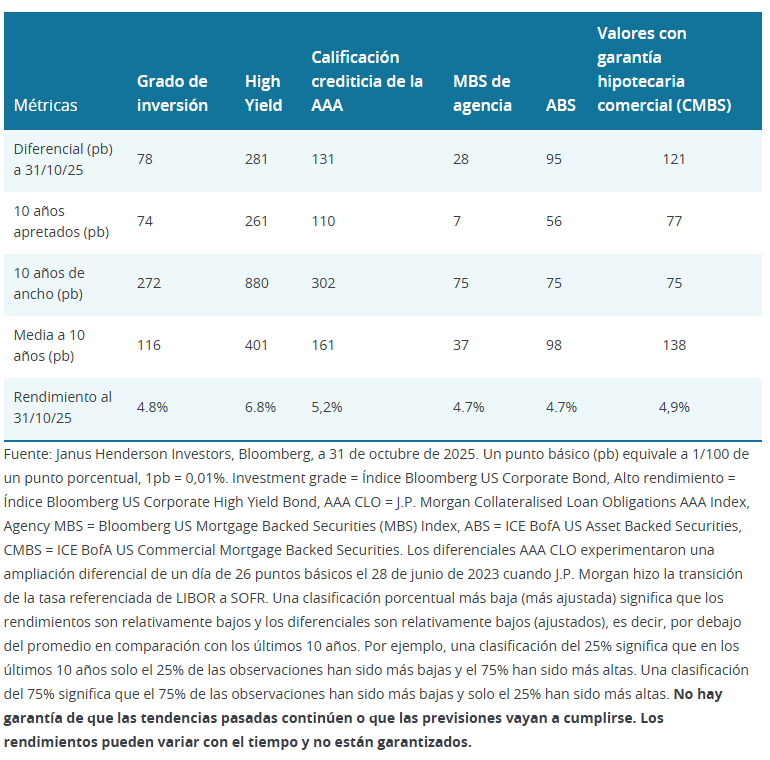 En conjunto, creemos que los ingresos serán el principal impulsor de los rendimientos de la renta fija en 2026. Las valoraciones caras implican que los inversores deben ser más selectivos, pero creemos que es demasiado pronto para anunciar el fin del ciclo de crédito. En nuestra opinión, los inversores deberían considerar el amplio espectro de la renta fija, utilizando no solo áreas convencionales como los bonos soberanos y corporativos, sino también considerando las oportunidades y el potencial de ingresos que ofrecen los activos de titulización y el crédito privado.
