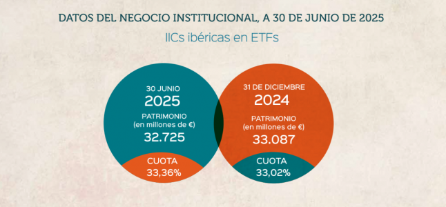 En lo referente a los ETFs, su presencia en las carteras institucionales en los seis primeros meses del año se ha visto reducida en un 1,09%, 362 millones menos que dejan el total invertido en 32.725 millones. En todo caso, en términos globales aumentan su cuota de mercado entre las IICs nacionales, pasando de representar el 33,02% a cierre del pasado año a un 33,36%.