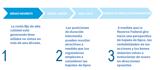 En Estados Unidos, la Reserva Federal ha dado indicios de un giro planificado en su política. Históricamente, un período de bajadas de tipos ha sido un momento atractivo para aumentar la duración de las asignaciones a renta fija. Si los tipos bajan, creemos que la renta fija de alta calidad de duración intermedia podría generar retornos totales sustancialmente mayores que las tires actuales. En los últimos cinco ciclos de ajuste de la Reserva Federal, los índices de renta fija de alta calidad han quedado por delante del índice Bloomberg U.S. Aggregate para bonos a corto plazo y efectivo en los periodos de uno y tres años posteriores a la última subida de tipos, en algunos casos, por márgenes significativos. Por ello, los inversores deberían considerar medidas para reducir su efectivo y equivalentes de efectivo, ampliar la duración de su cartera y asegurar las tires. Una parte importante de las perspectivas del mercado de bonos dependerá de cómo los cambios en la política monetaria se ajusten o no a las expectativas que descuentan los inversores. También estaremos atentos a las decisiones posiblemente divergentes de los bancos centrales de diferentes regiones de todo el mundo.