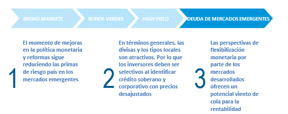 Creemos que la favorable evolución de la deuda de los mercados emergentes que comenzó a finales de 2022 está a punto de acelerarse, impulsada por la mejora en la política monetaria y la continuación de las reformas. El regreso a una política ortodoxa ha sido el tema principal en gran parte de los países al comenzar el año, mientras que multitud de reformas llevadas a cabo con éxito han ampliado el universo de inversión. El anterior ajuste de la política monetaria en la mayoría de los países emergentes hace que los tipos locales sean atractivos, pues los tipos reales siguen siendo altos y la mejora de las perspectivas de crecimiento favorece el riesgo de moneda local. Con respecto a los mercados de crédito, lo mejor para los inversores es ser selectivos, ya que los diferenciales de crédito soberano y corporativo a nivel índice no ofrecen mucho valor. Es probable que la posibilidad de que la política monetaria se flexibilice en los mercados desarrollados respalde esta clase de activo durante la segunda mitad del año.