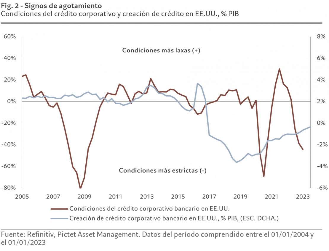 Las presiones sobre los márgenes financieros, el endurecimiento de las condiciones para la concesión de préstamos y la probable introducción de medidas reglamentarias más estrictas están frenando la disposición de los bancos a prestar (véase la fig. 2). Los préstamos bancarios de la zona euro se han paralizado, mientras que en EE.UU. se han ralentizado hasta alcanzar tan solo el 1,5% del PIB, frente a la media del 4% registrada en ambas regiones en 2022.