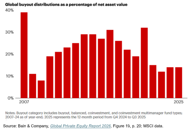 De hecho, esta dinámica no es aislada. El Global Private Equity Report 2026 de Bain & Company confirma que las distribuciones se mantienen en niveles cercanos al 14% del NAV, muy por debajo de los promedios históricos, y que los periodos de tenencia se han extendido a aproximadamente siete años en promedio.
