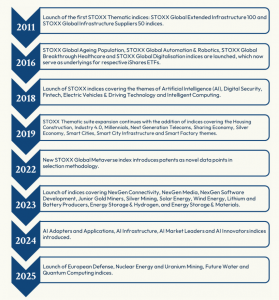 STOXX se ha consolidado como el proveedor líder de índices para estrategias temáticas en Europa, gracias a su amplia experiencia, su gran capacidad de personalización, la disponibilidad de datos sólidos y su enfoque colaborativo en el diseño de índices con sus clientes. Esta colaboración abarca todo el proceso, desde la concepción del concepto hasta la construcción del índice y el lanzamiento del producto, ofreciendo soluciones rápidas y adaptadas a las necesidades de nuestros clientes.