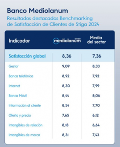 Para determinar la satisfacción global, la encuesta de Stiga analiza un total de 11 aspectos para determinar el grado de satisfacción de los clientes con su banco, de las que Banco Mediolanum participa en 9, lidera 4 de ellas y se encuentra en el podio en un total de 8. Estas categorías, aparte de las mencionadas anteriormente, incluyen satisfacción con la banca por internet, banca móvil, oferta y precio e intangibles de relación (transparencia, confianza y personalización).