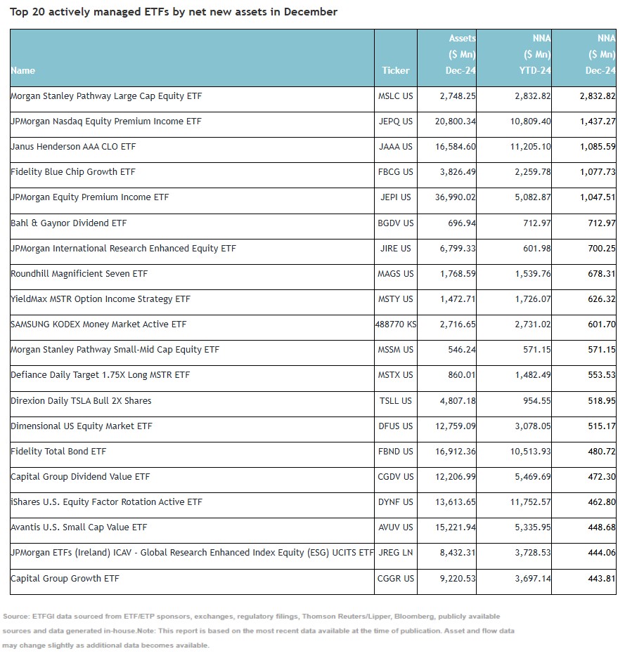 Estas sustanciales entradas de flujos de inversión pueden atribuirse a un puñado de 20 principales ETFs/ETPs activos, que en conjunto reunieron 15.710 millones de dólares en diciembre de los 41.780 millones totales. Morgan Stanley Pathway Large Cap Equity ETF (MSLC US) reunió 2.830 millones de dólares, la mayor entrada neta individual.