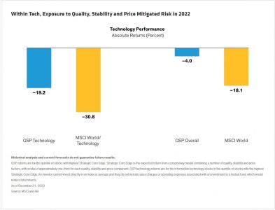 A la calidad por sí sola le fue mal en 2022, pero la calidad junto con la estabilidad funcionó mejor, al mismo tiempo que mitiga el riesgo. En el caso de la tecnología, este diferencial de comportamiento fue particularmente llamativo. Las estrategias de baja volatilidad que buscaban equilibrar el riesgo y el rendimiento a través de la selección de acciones bottom-up en las defensas tradicionales, así como en sectores como tecnología, finanzas y energía, tenían más palancas para manejar la volatilidad.