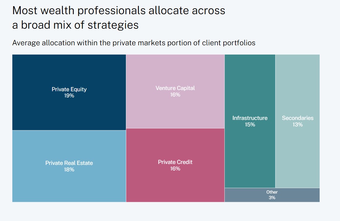 Aunque el informe reconoce que los puntos de entrada a los mercados privados suelen comenzar por private equity y venture capital y growth, insiste en que la educación sigue siendo clave: el 81% de los profesionales de patrimonio afirma que la formación del cliente incrementa significativamente el interés por los mercados privados, lo que subraya la importancia de cerrar brechas de conocimiento, especialmente a nivel de producto.