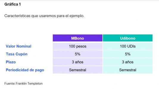 En ese sentido, un Udibono, al estar emitido en UDIs, tiene protección inflacionaria a lo largo del tiempo. Pongamos un ejemplo. Imaginemos 2 bonos idénticos, salvo la moneda en la que están emitidos. Uno de ellos está en pesos (un MBono), y otro está en UDIs (un Udibono). Ambos bonos tienen las siguientes características (Gráfica 1):