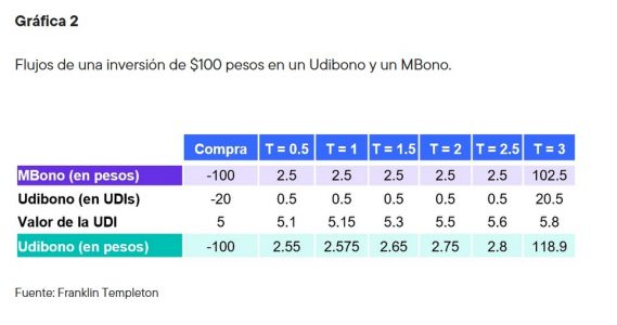 Como podemos observar, la única diferencia que tienen es la “moneda” en la que están emitidos. Ahora bien, asumamos que hoy la UDI está en $5 pesos, y que queremos invertir $100 en cada bono, es decir, tendremos que comprar $100 del MBono y 20 UDIs del Udibono (pues, 20 UDIs x $5 por UDI = $100 pesos). Ahora bien, ¿cómo se comportarán los flujos? (Gráfica 2):