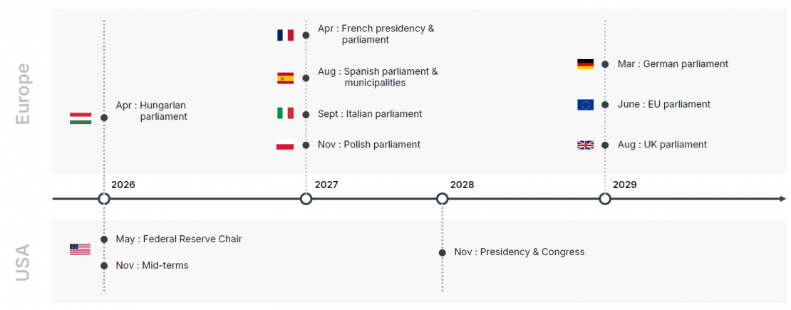 Los expertos nos hablan de tener en cuenta que a lo largo de los próximos dos años se celebrarán varios procesos electorales clave, como las elecciones generales en Hungría y las elecciones de mitad de mandato en EE.UU. en 2026. A estas se sumarán los comicios que tendrán lugar en 2027 en Francia, España, Polonia e Italia en 2027.