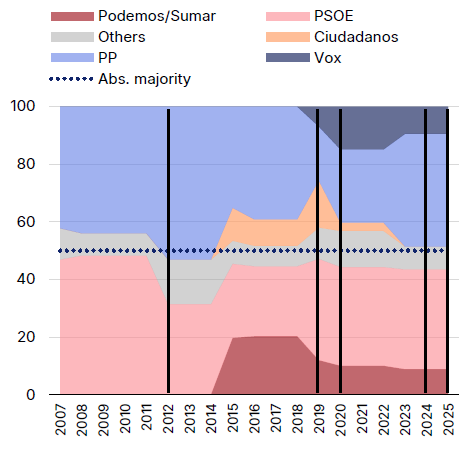 En su informe hablan sobre la actual polarización en Europa, incluido el creciente apoyo público a los extremos políticos, lastra el impulso de las reformas estructurales. Por ejemplo, en España la fragmentación parlamentaria, con un Gobierno en minoría desde 2016, ha imposibilitado aprobar nuevos Presupuestos Generales desde 2023. Además, en EE.UU., el debilitamiento de la gobernanzareduce la previsibilidad y la estabilidad de la formulación de políticas en el país, lo que aumenta el riesgo de errores políticos. En este sentido, la gobernanza de la Reserva Federal y las elecciones de mitad de mandato son claves para las perspectivas de EE.UU.