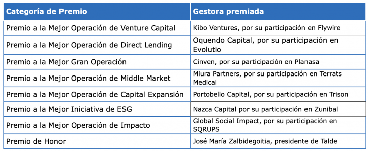 Kibo Ventures, Oquendo Capital, Cinven, Miura Partners, Portobello Capital, Nazca Capital, Global Social Impact y José María Zalbidegoitia (Talde) son los galardonados en la 17ª Edición de los Premios al Capital Privado, organizada por SpainCap, Deloitte e IESE Business School. Estos galardones confirman la contribución del sector de venture capital & private equity a la dinamización de las pymes españolas.