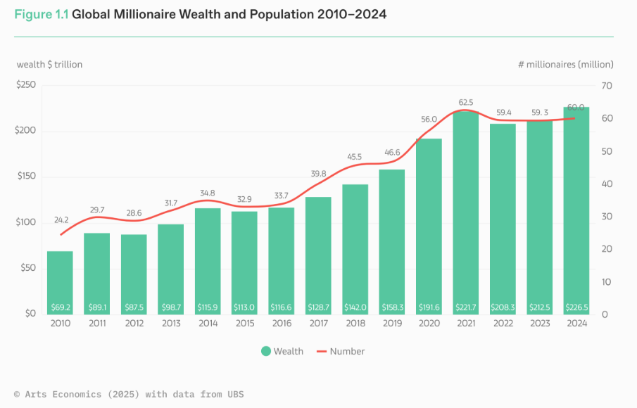 Aunque el valor total de las ventas de arte cayó en 2024, la riqueza de los individuos más ricos siguió aumentando: la población de millonarios alcanzó los 60 millones a comienzos de 2025, con una riqueza agregada de 226,5 billones de dólares. Esta concentración de riqueza refuerza la base potencial de compradores del mercado del arte, aunque en la práctica muchos optaron por conservar sus activos durante 2024 debido al periodo de incertidumbre.