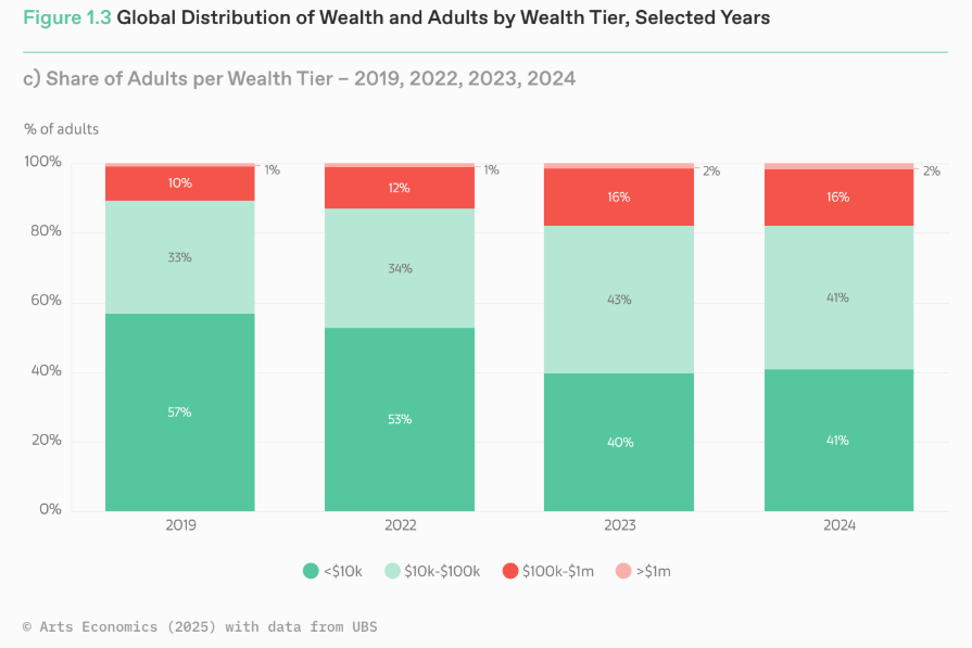 Por otro lado, la concentración extrema de la riqueza —menos del 2% de la población posee casi la mitad de los activos financieros globales— plantea preguntas sobre el grado de dependencia del mercado del arte respecto a un grupo reducido de compradores.